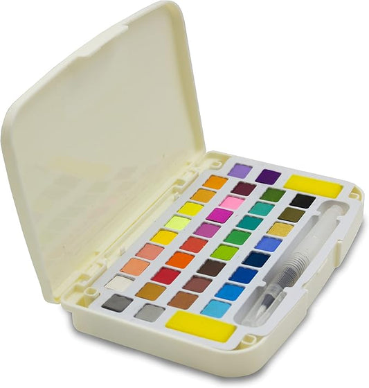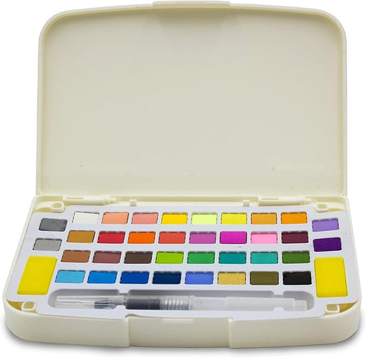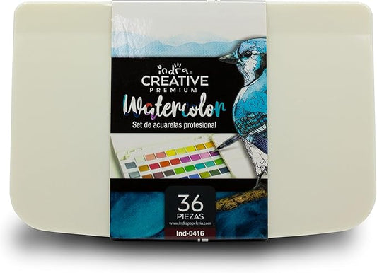 SET DE ACUARELAS PROFESIONAL, EN PASTILLA, 36 COLORES, GODETE Y PINCEL CON DEPOSITO DE AGUA MARCA INDRA MODELO IND-0416