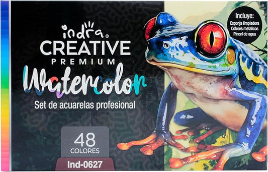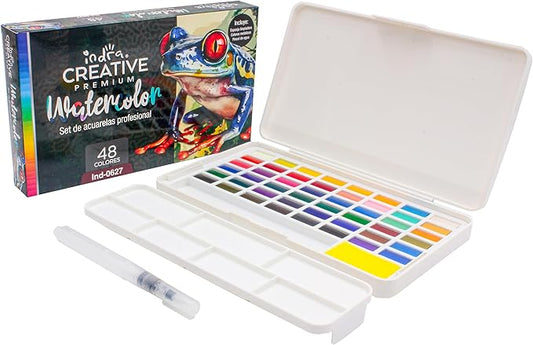 SET DE ACUARELAS PROFESIONAL, EN PASTILLA, 48 COLORES, GODETE Y PINCEL CON DEPOSITO DE AGUA MARCA INDRA MODELO IND-0627