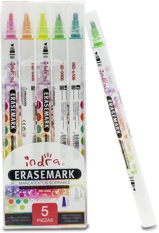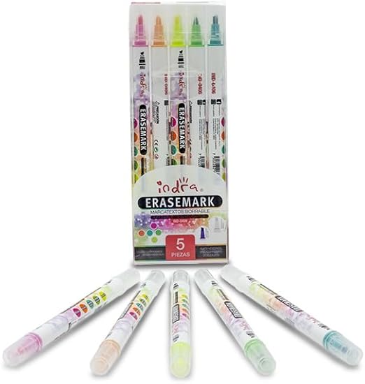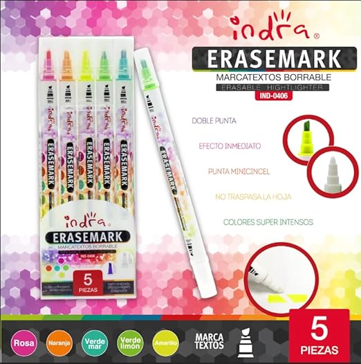 MARCATEXTOS BORRABLE, PUNTA CINCEL, 5 COLORES. MODELO ERASEMARK. MARCA INDRA.