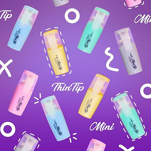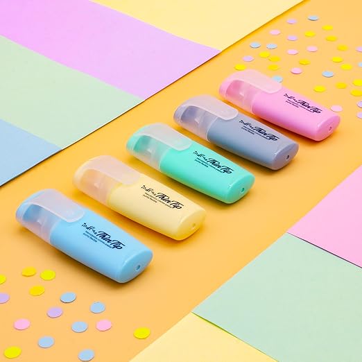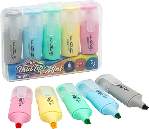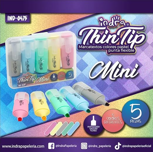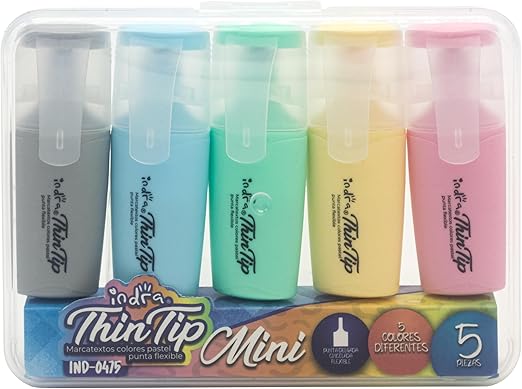 MARCATEXTOS MINI, PUNTA CINCEL FLEXIBLE, 5 COLORES PASTEL. MODELO THIN TIP MINI. MARCA INDRA.